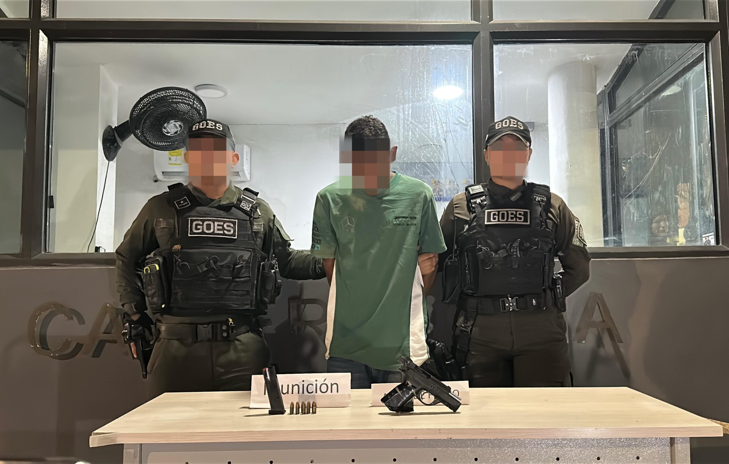 En desarrollo de planes contra el porte ilegal de armas, uniformados de la Policía Nacional de Colombia lograron interceptar y capturar en las últimas horas a un sujeto, quien tenía en su poder un arma de fuego tipo pistola, en el barrio Las Palmeras.