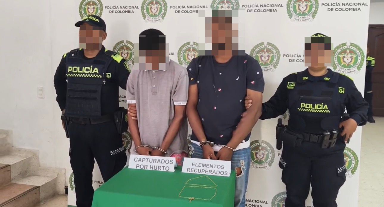 En desarrollo de planes contra el hurto, uniformados de la Policía Nacional de Colombia lograron interceptar y capturar en las últimas horas a dos sujetos, quienes minutos antes habían despojado de dos prendas de oro a un ciudadano.